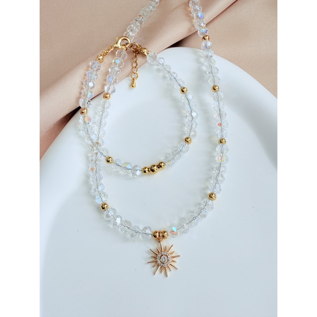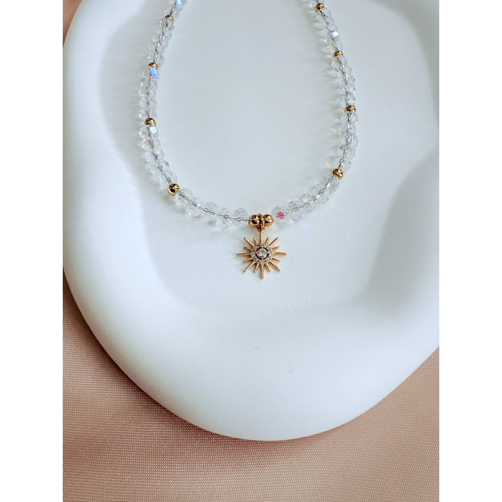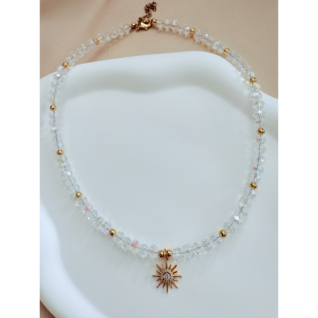 Broušené sklo čiré s duhovými odlesky, kovové perličky zlacené 18-ti karátovým zlatem, hvězda se zirkony zlacená 18-ti karátovým zlatem, zapínání, súojovací díly a prodlužovací řetízky zlacené 18 K zlatem.