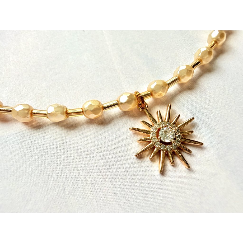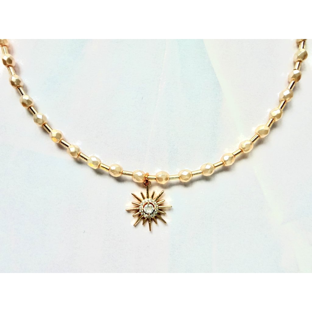 Tento šperk je z českého broušeného skla v jemných perlových tónech. Barva je světle krémová a šperk zdobí s přívěsek se zirkony, který připomíná slunce.