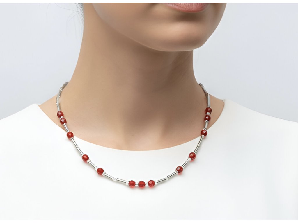 Minimalistický náhrdelník s rudými ohňovým perlami a tyčinkami v titanové barvě