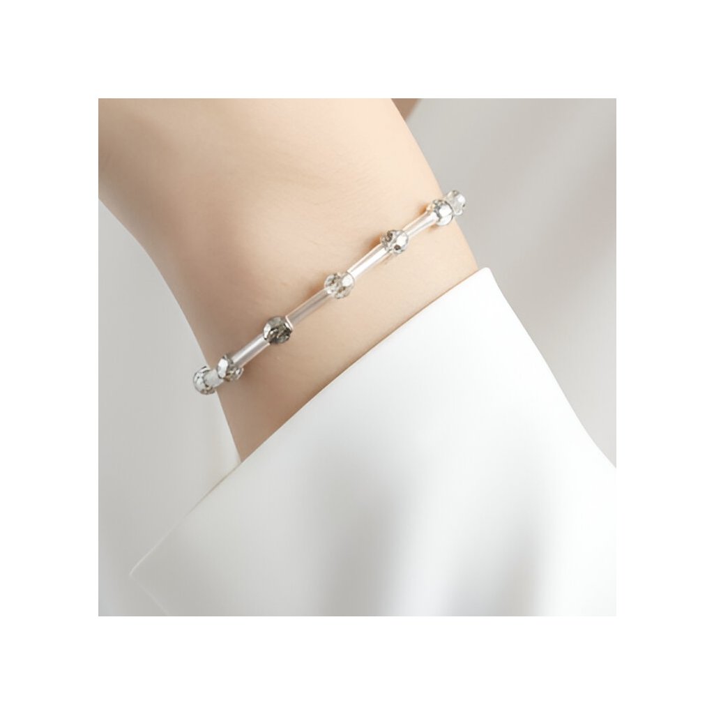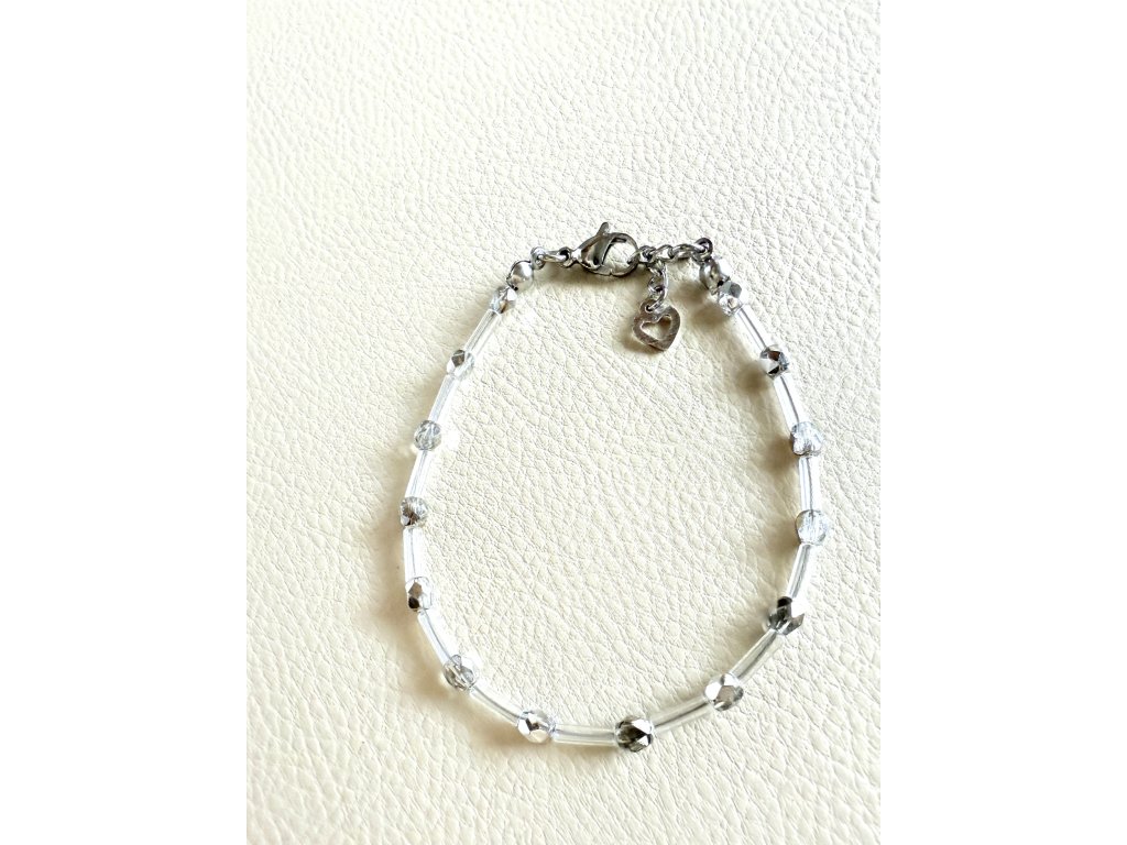 Jemný minimalistický náramek z broušených stříbřitě-čirých skleněných perel v kombinaci s čirými tyčinkami.