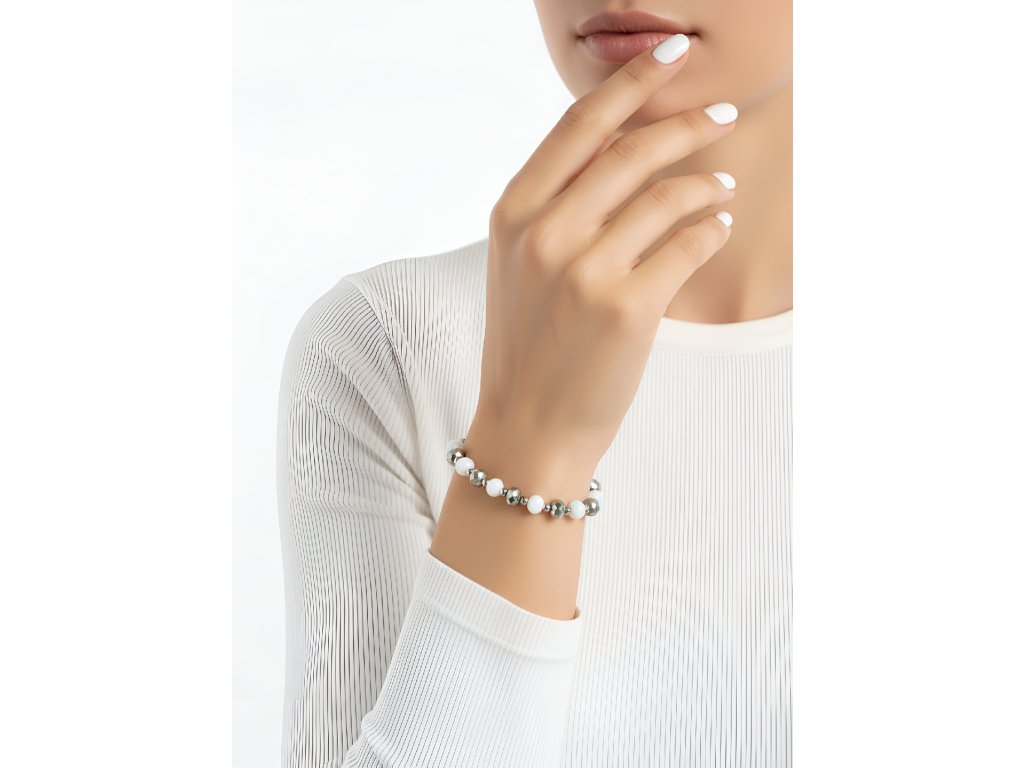 Náramek z broušených skleněných perel v bílém a stříbrném odstínu.